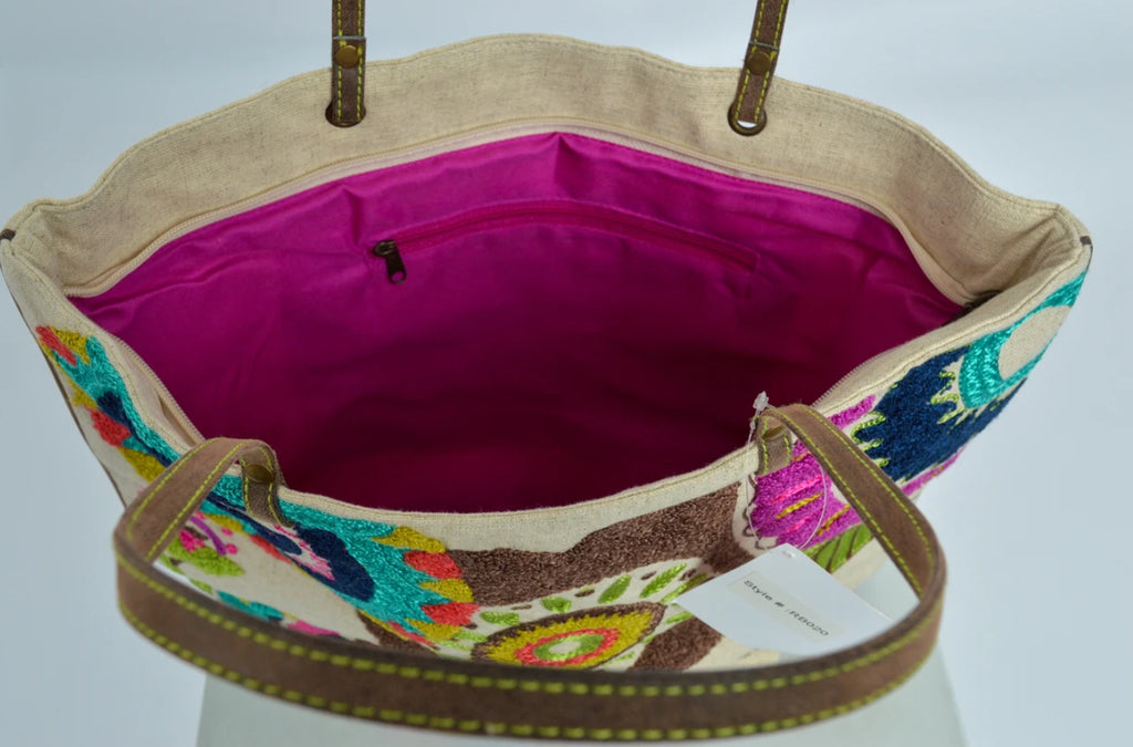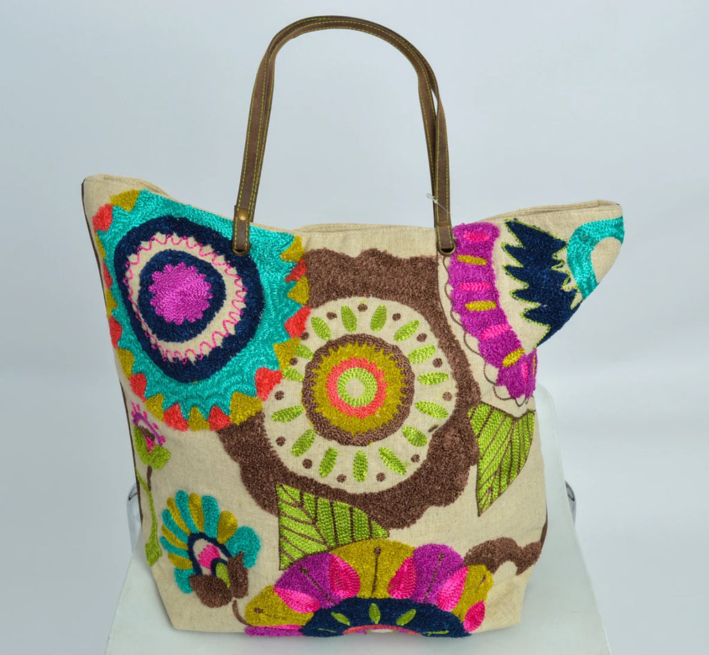 RUMIBeautifully embroidered canvas tote bag with leather handles