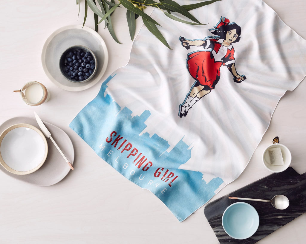 Image on box is exactly what is printed on the tea towel. Has hanging loop hole. Made in Australia.