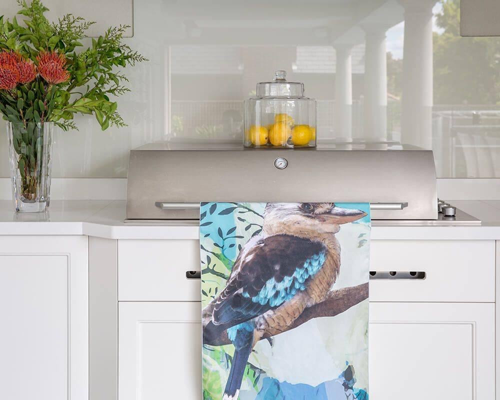Image on box is exactly what is printed on the tea towel. Has hanging loop hole. Made in Australia.