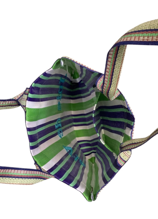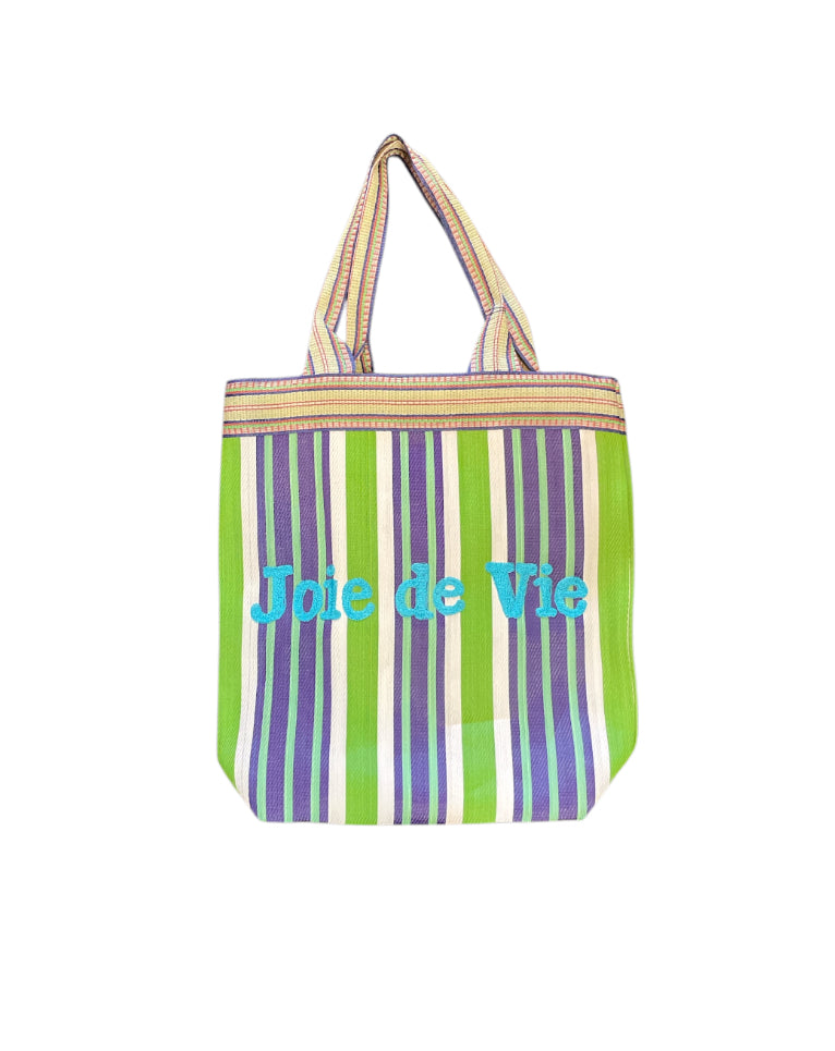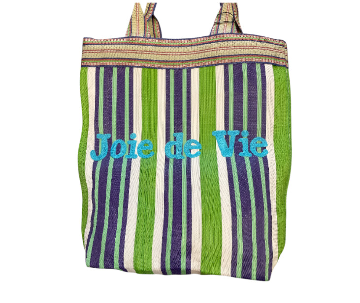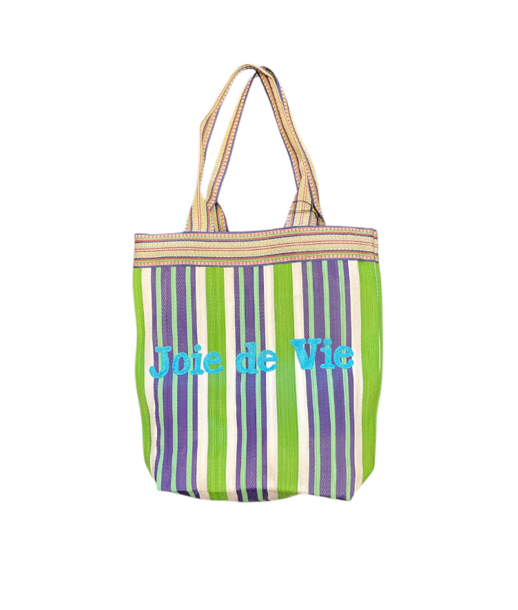 Serenity Australia“Joie de Vie” or “Joy of Life” is what you will feel as you step out sporting this bright, colourful and fun recycled tote. Made from recycled plastic bags every purchase helps the environment. This waste-reducing durable material is perfect for travel, beach, market trips and every day use. With an inside pocket for storing your smaller personal items this tote will become your daily go to run around bag.