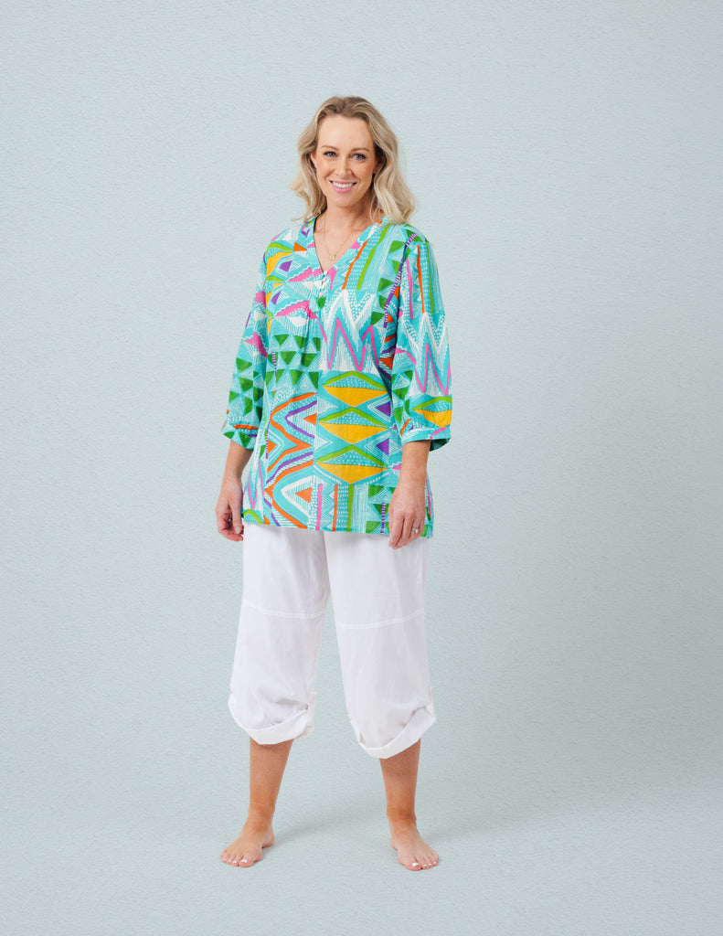 MozaicClara is a simple, easy-to-style top with a classic shape. The 100% soft cotton keeps it breathable, while narrow cuffs and roulette buttons add a neat finish.
