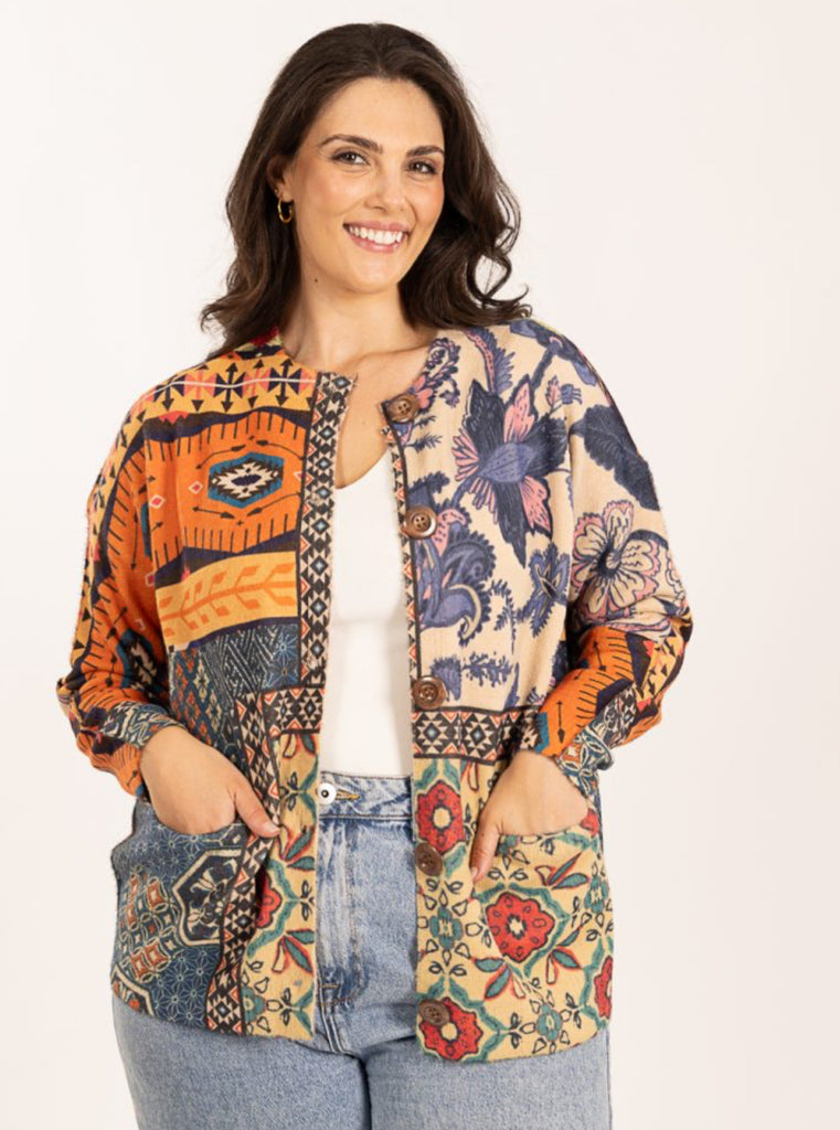 Serenity AustraliaThis beautiful cardigan has bright, multi-colours in florals, geometric and traditional designs. This style has 5 buttons from neck to mid hip. The material has a beautiful weight to it, washes really well and wears like a dream.